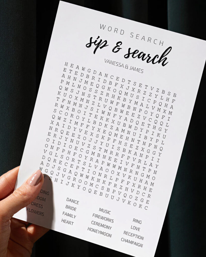 Za goste koji uživaju u laganom rješavanju zagonetki uz čašu vina i druženje. Možete personalizirati pojmove tako da budu vezani uz vašu ljubavnu priču. Postavite ove kartice na stolove uz olovke. Estetski izgledaju jako lijepo kao dio dekoracije, a olovke možete personalizirati svojim inicijalima.