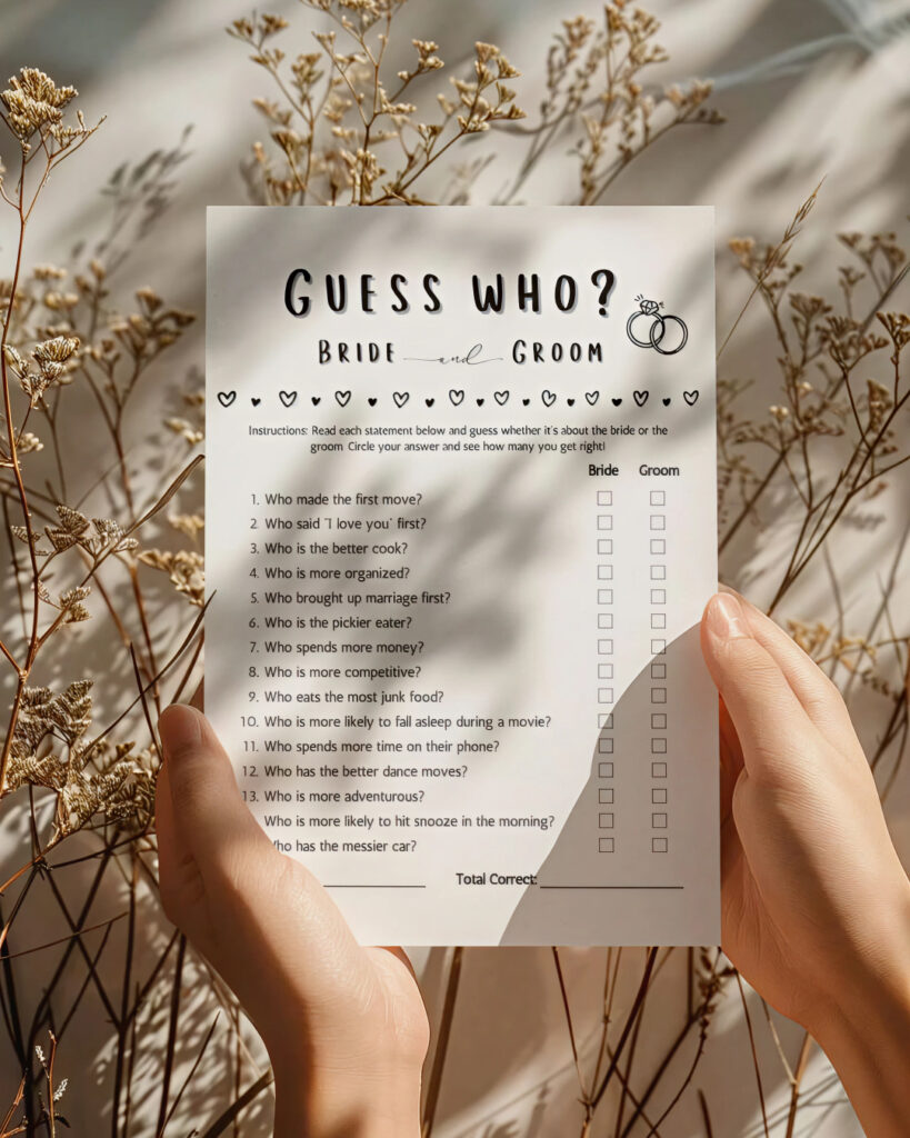 Testirajte koliko vaši gosti zapravo poznaju vas kao par. Na karticama su navedene tvrdnje, a gosti trebaju označiti odnosi li se to na mladenku ili mladenca. Sigurno ćete se kasnije ćete slatko nasmijati kada vidite što vaša obitelj i prijatelji misle o vašoj dinamici.
