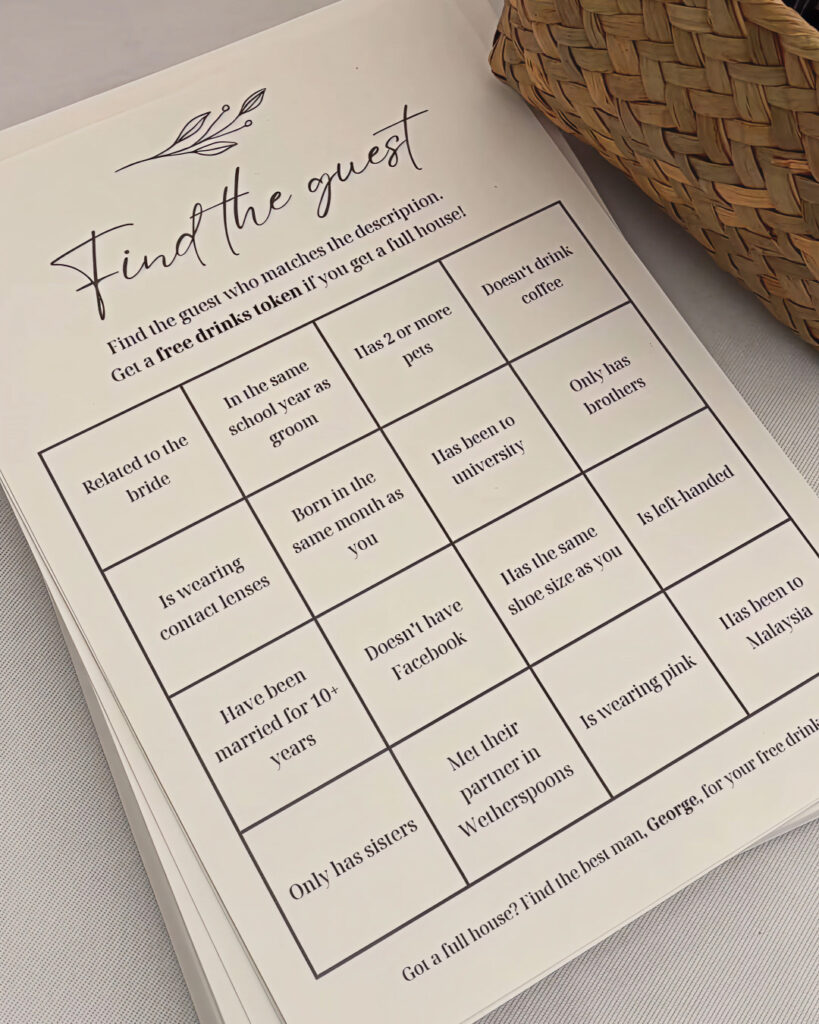 Ova igra je savršen Icebreaker! Cilj je da gosti komuniciraju međusobno kako bi pronašli osobu koja odgovara opisu iz kvadratića.